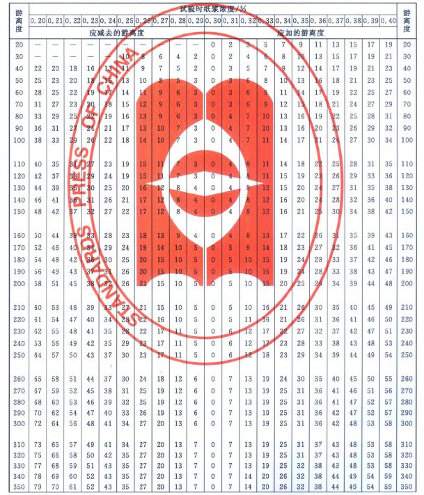 注4:在試驗中,如漿料濃度偏差大於0. 01%或溫度偏差大(dà)於0.5℃,所測數值應按附錄F和附錄G給出的校正表加以校正。