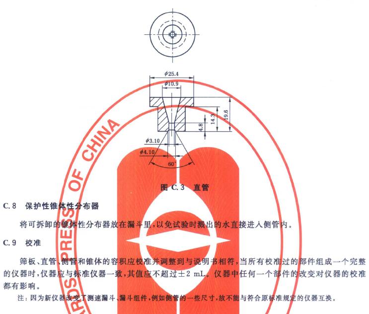 直管(guǎn)的總長是19.6 mm。這一文丘裏孔的直徑可(kě)在校正時調節。即當20.O℃±0.5℃的水以725 mL/min±5 mL/min的速度注入時,應(yīng)以529 mL/min~531.5 mL/min的(de)速(sù)度流出。當直管裝配在測速(sù)漏(lòu)鬥上後,排出口的流速(sù)應為530 mL/min,波動在±1%以內(nèi)。
