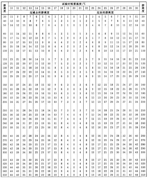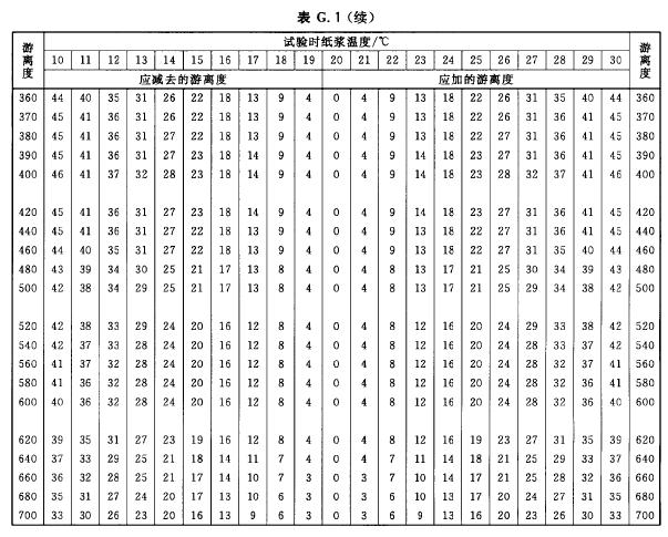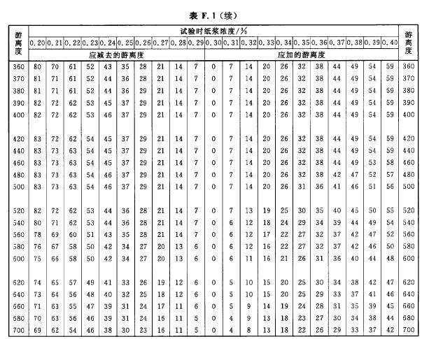 表F.1為(wéi)“加(jiā)拿大標準”遊離度儀修正至紙漿濃(nóng)度為(wéi)0. 30%時的遊離度表。