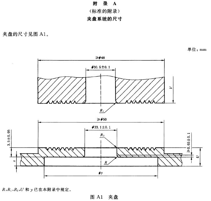 為了牢固而均勻地夾住試樣(yàng),上、下兩夾盤是兩個彼此平行的環形平肉。其(qí)環麵應平滑並帶有溝紋(見附錄A),附錄八給出了夾盤係統的尺寸。