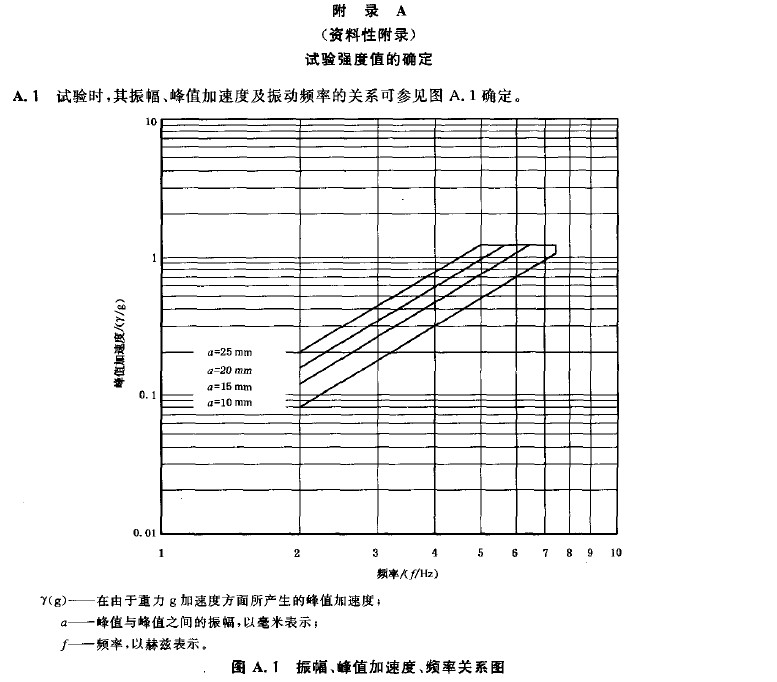 5.6.3.2 選擇一定(正負)峰值之間的位移(參見附錄A的圖A. 1),在相應的頻率範圍內確(què)定試驗頻率,產生在。.5 g 和1.0 g 之(zhī)間的加速度值,進行試驗。