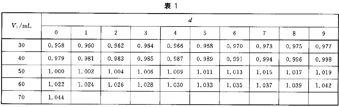 d— 消耗50%(質量(liàng)/質量)高錳酸鉀(jiǎ)的校正因子,d依V,值而確定(見表1);