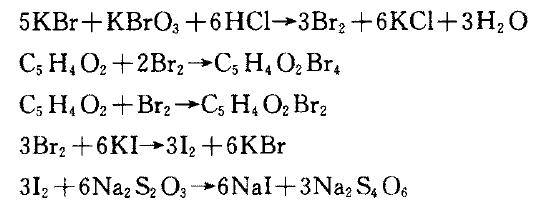 含糠醛的溶液在(zài)室溫下與過量澳作用 1h,則 1m ot糠醛可與4.0 5m ot澳原子化合,稱為四澳(ào)化法。